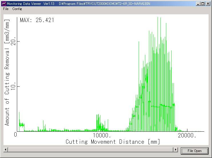 フリーソフトで公開しているTrMonitorを利用するとTRYCUT2000から出力されたモニタリングデータを解析し工具の単位移動ごとの加工負荷をグラフ表示することができます。