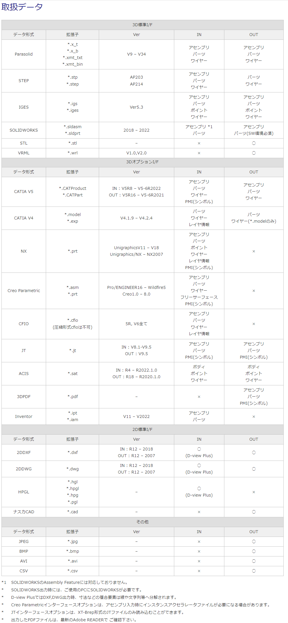 ・CATIA V4,V5・NX・Creo Parametric・SOLIDWORKS・Inventor・IGES・STEP・Parasolid・ACIS・CFIO・JT・3DPDF など豊富なCADデータフォーマットに対応しています。 |